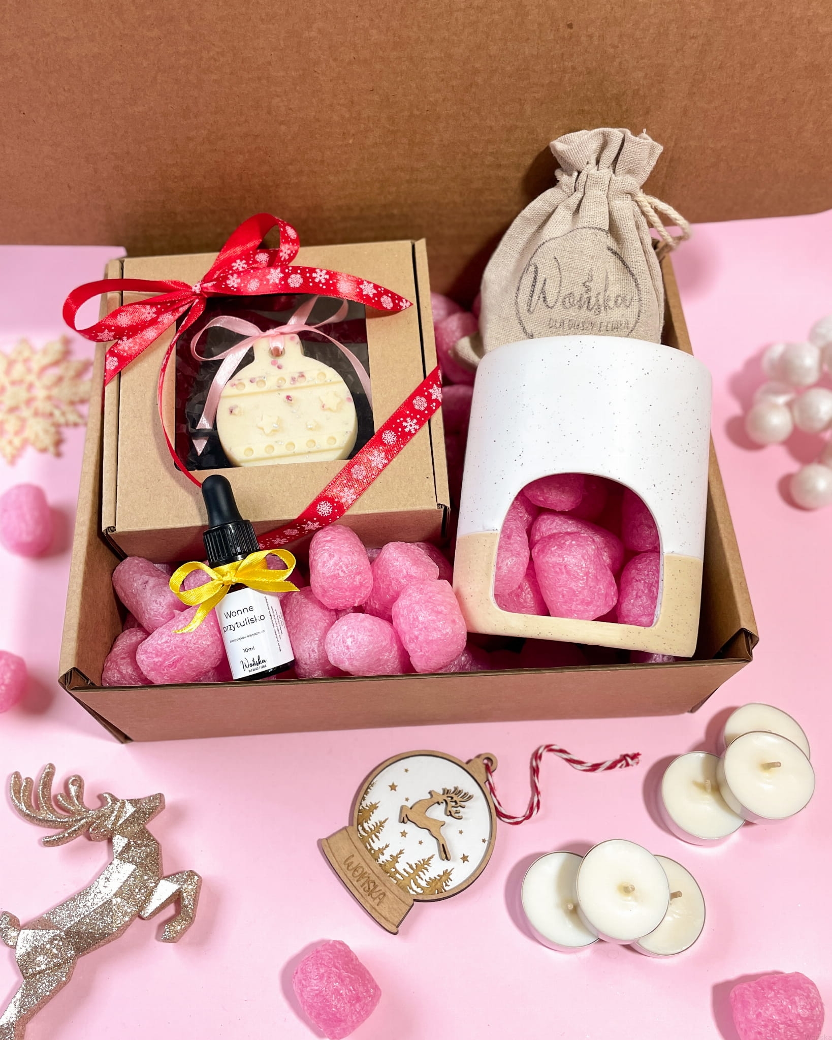 Wyobraź sobie świąteczny wieczór. W powietrzu unosi się aromat pomarańczy, cynamonu i drzew iglastych, a w tle gra spokojna muzyka. Wręczasz prezent – eleganckie, kraftowe pudełko z wstążką, które skrywa nie tylko piękne przedmioty, ale i chwilę spokoju, ukojenia i oddechu od codzienności.