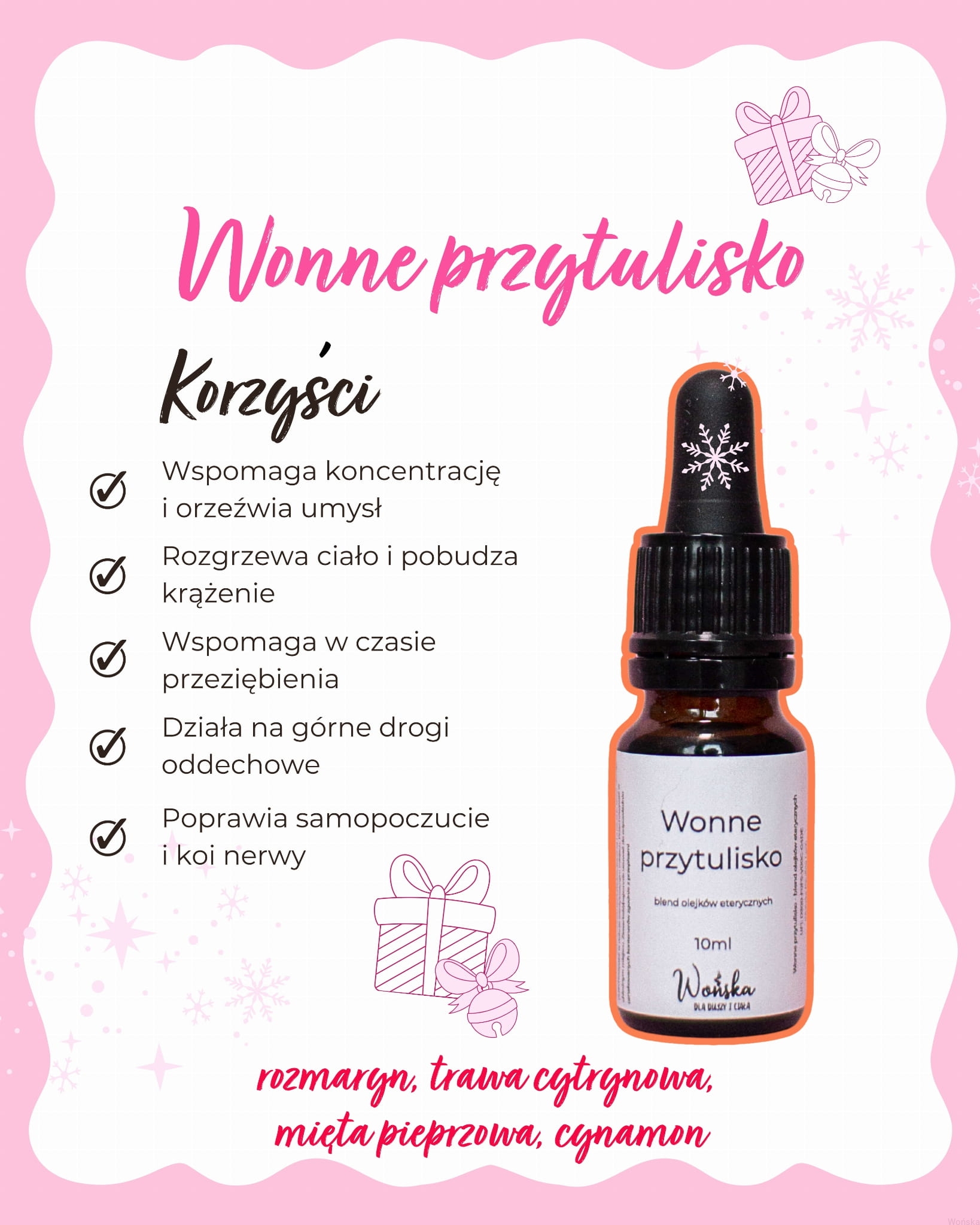 W sercu tego zestawu znajduje się blend olejków eterycznych „Wonne przytulisko” – moja autorska kompozycja, która łączy rozmaryn, miętę pieprzową, trawę cytrynową i cynamon.