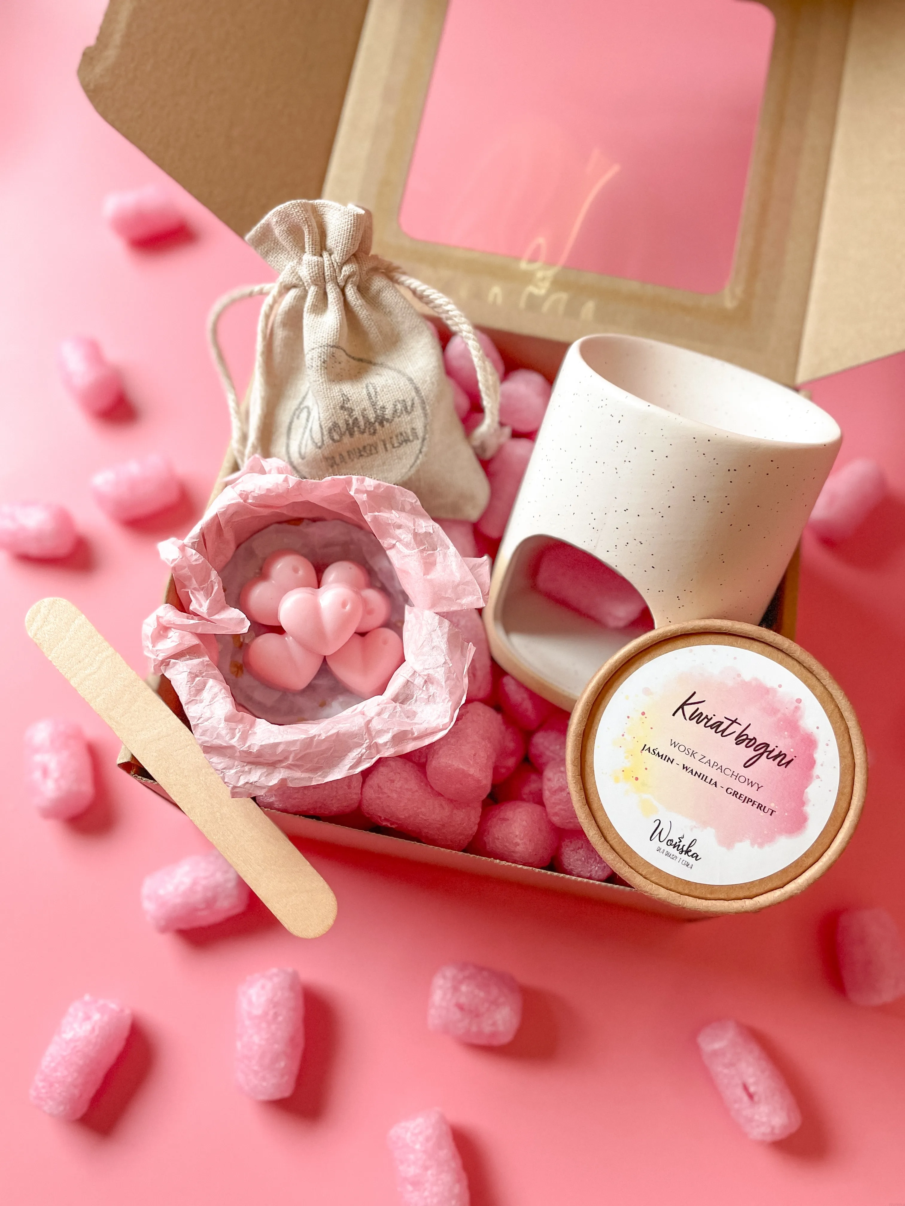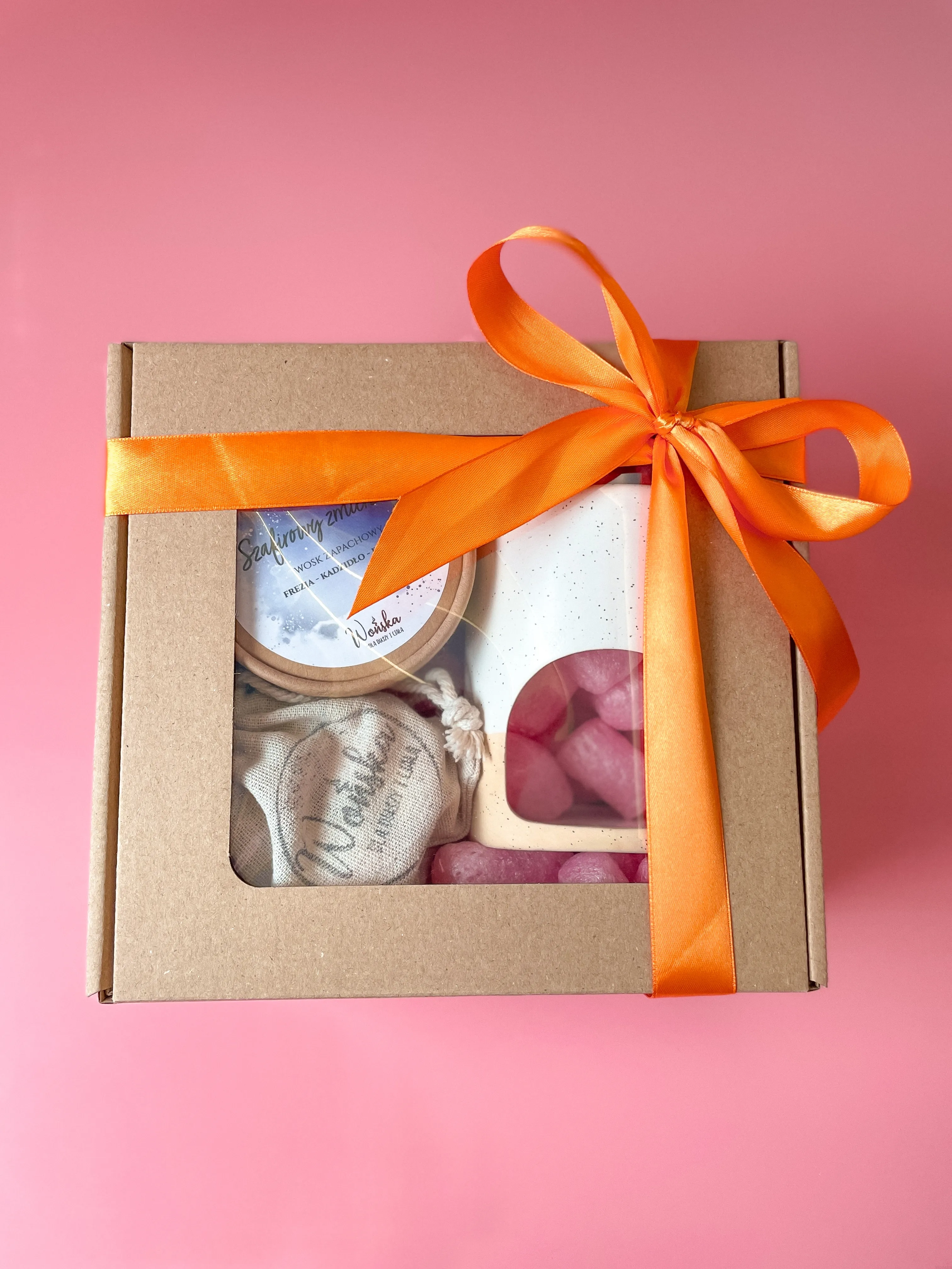 Całość zapakowana jest w kraftowe pudełko prezentowe z okienkiem i kolorową wstążką, dzięki czemu zestaw jest gotowy do wręczenia bez dodatkowego pakowania.